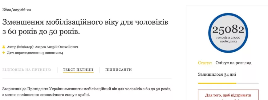 Петиция о снижении возраста мобилизации с 60 до 50 лет опубликована на сайте официального интернет-представительства главы государства. Она набрала необходимое число голосов почти за два месяца, дата опубликования — 5 июля 2024 года.