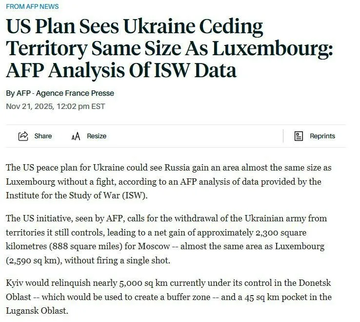 Инициатива США предусматривает вывод ВСУ с территорий, которые они все еще контролирует, что приведет «к чистому выигрышу» РФ почти 5000 кв. км территории в Донецкой области, которые будут использованы для создания буферной зоны, а также Киеву останется анклав площадью 45 кв. км в Луганской области.