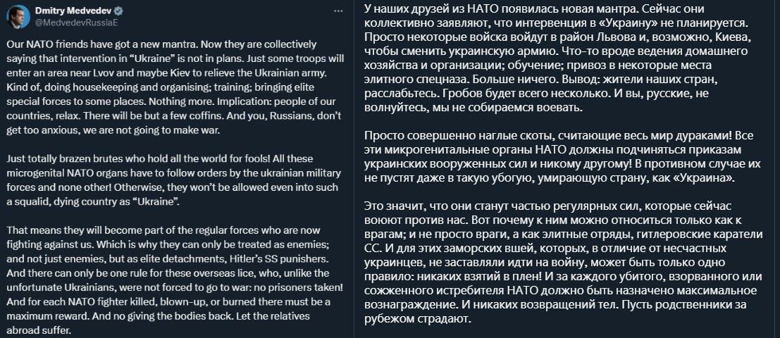 И за каждого убитого, взорванного или сожженного истребителя НАТО должно быть назначено максимальное вознаграждение. И никаких возвращений тел. Пусть родственники за рубежом страдают», – написал Медведев.