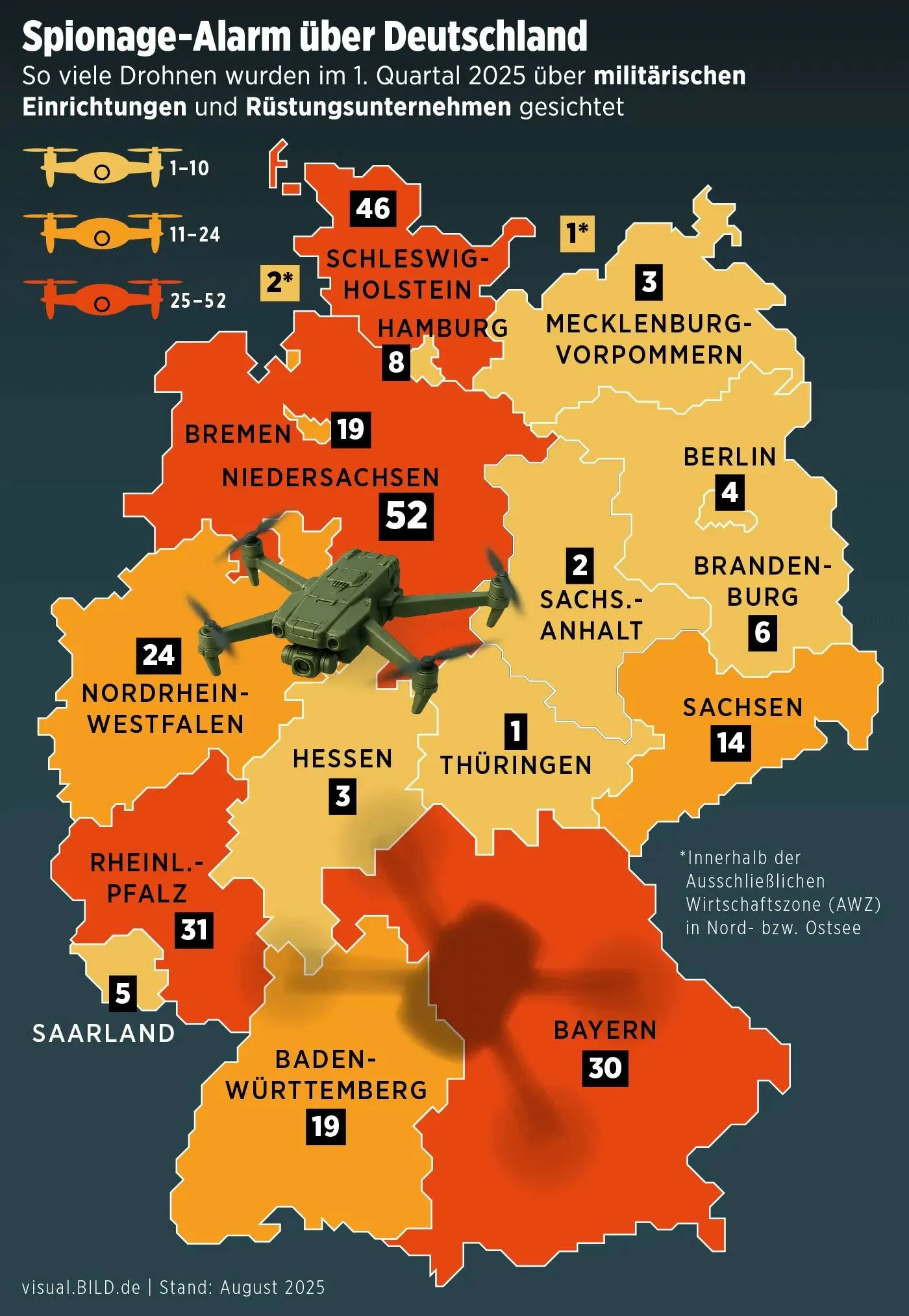 Особенно часто дроны замечали вокруг военных объектов-здесь зарегистрировано 117 сообщений. Эпицентрами стали военно-морская база бундесвера в Вильгельмсхафене и авиабаза Рамштайн, где одновременно было зафиксировано до 15 дронов.