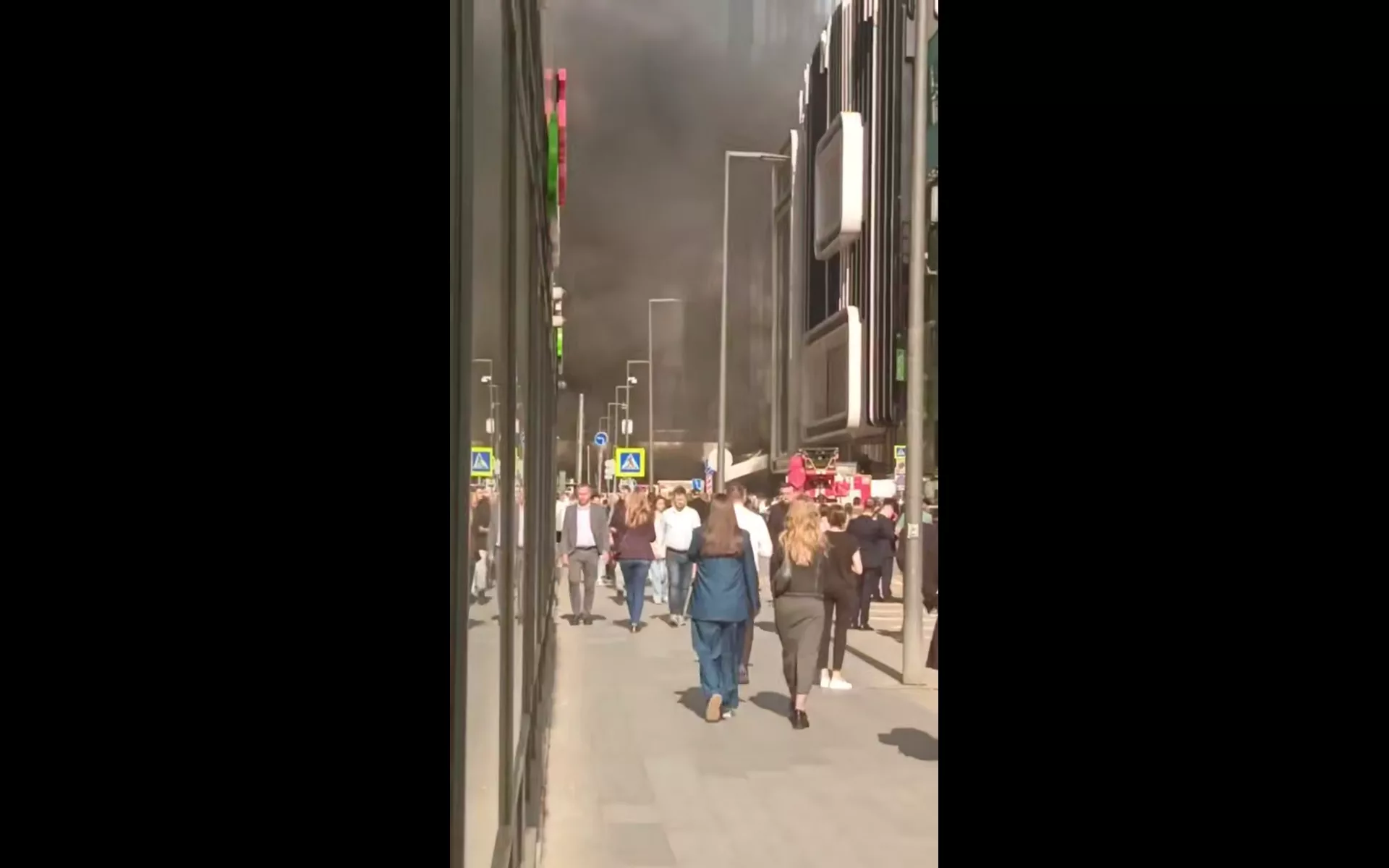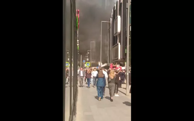 Автомобиль горит на парковке башни «Меркурий». Спасатели проводят тушение и принимают меры по обеспечению безопасности людей и предотвращению распространения огня.