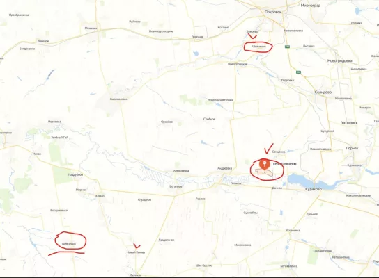 Стоит помнить, что Шевченко к югу от Красноармейска 3 штуки. 2 из них — к югу от окраин Красноармейска и к северо-западу от окраин Курахово мы уже освободили.