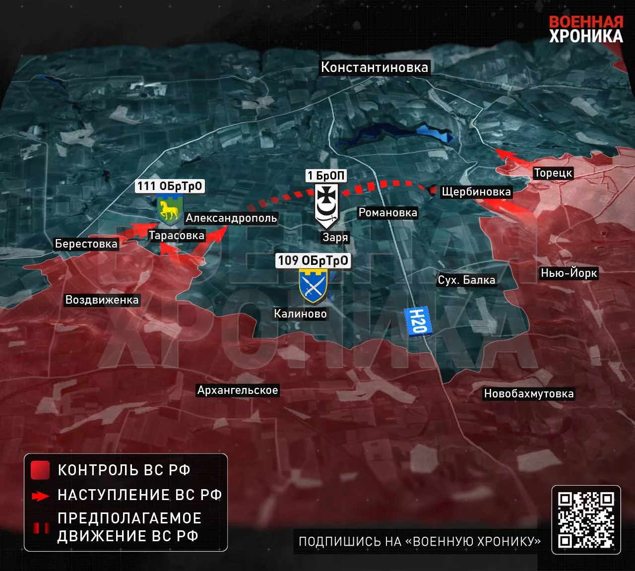 ВСУ на этом направлении — на прямом пути к окружению. Если ВС РФ начнут движение со стороны Дзержинска, то вся группировка украинской армии севернее Новокалиново и Новобахмутовки попадёт в «клешни» — это первый вариант. Второй — формирования ВСУ будут вынуждены отойти к Константиновке и оставить укрепы.