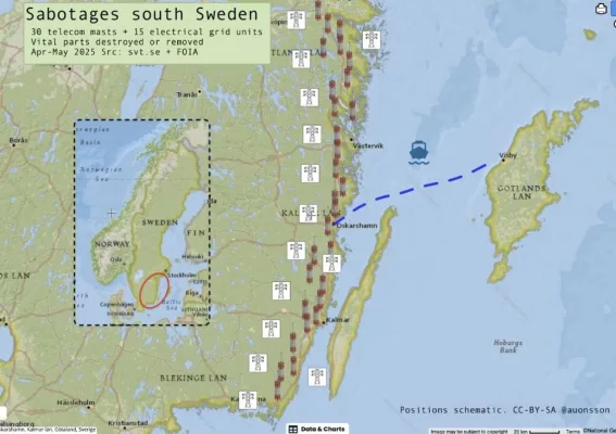 По данным шведских властей , было совершено около 30 диверсионных атак на телекоммуникационную инфраструктуру, большинство из которых произошло вдоль трассы E22. Причины этих атак до сих пор не установлены.