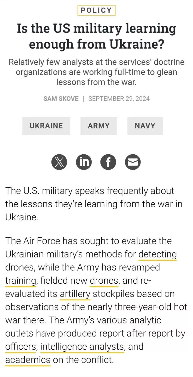 И аудиторы пришли к неутешительным выводам. По их мнению Вашингтону нужно срочно нарастить количество аналитиков на этом направлении. Так в профильном подразделении Армии США «Армейском центре извлечения уроков» (CALL) из 45 аналитиков только 4 заняты изучением украинского опыта, при этом профильной группы по украинской войне не создано.