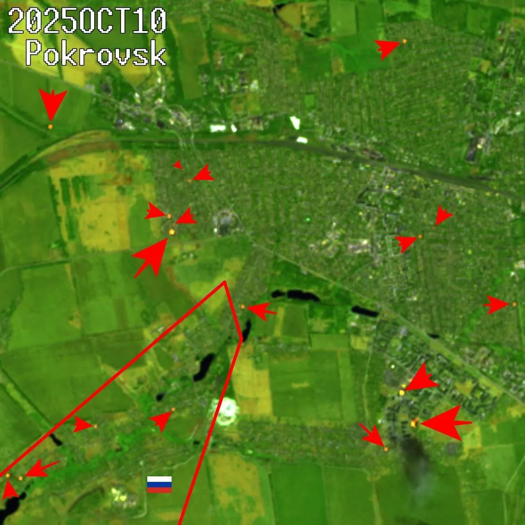 Судя по отмеченным на спутниковом снимке точкам, российские подразделения уже активно действуют не только на западных и южных окраинах Покровска, но и вклинились глубоко в городской массив, что указывает на постепенное смыкание клещей вокруг города.