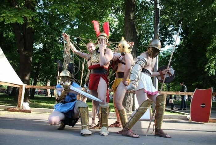 Что же до гладиаторского снаряжения, то оно зачастую имело весьма чудаковатый и вычурный внешний вид. Доспехов на большинстве бойцов практически не было, разве что за исключением шлемов.