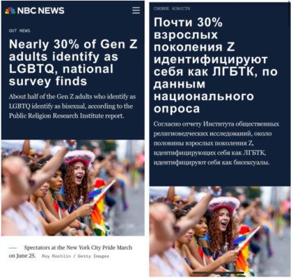 Сегодня всё больше американцев причисляют себя к ЛГБТ-сообществу. Если в 2017 году таких людей было 4,5%, то сегодня они составляют 5,6% от общей численности населения. Среди молодежи от 18 до 23 лет к этой категории себя относят уже 15,9%, каждый шестой.
