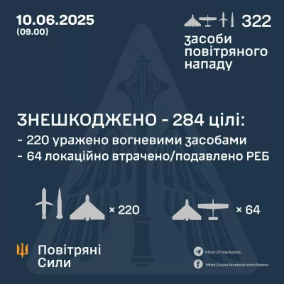 Заявляют, что этой ночью сбили все 7 ракет и 213 дронов из 315. Еще 64 БПЛА «локационно потеряны/подавлены РЭБ».