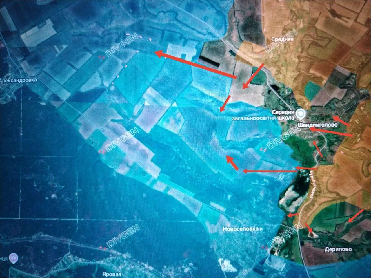 Западнее Шандриголово ВС РФ вышли на высоты (западнее ставков и севернее Новосёловки), создав угрозу окружения гарнизона противника, и продолжают продвижение в направлении Коровьего Яра, Александровки и Святогорска.