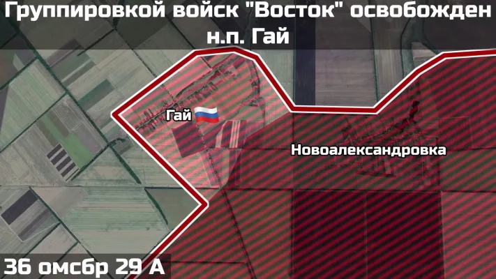- Штурмовые подразделения 36 гвардейской мотострелковой бригады 29 армии группировки войск «Восток» решительным броском от Вишневого на северо-запад освободили населённый пункт Гай Днепропетровской области. Взяли под контроль важный дорожный узел на Покровское и Отрадное, а также участок местности площадью более 5 квадратных километров.