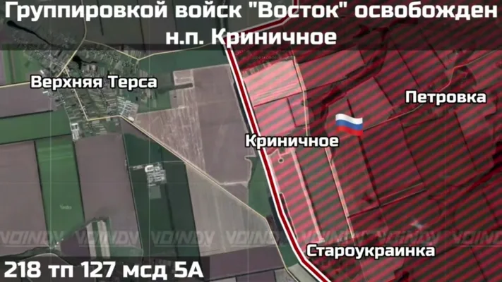 Гвардейцами 218 танкового полка 127 мсд 5 армии группировки войск «Восток» решительными и умелыми действиями взят под контроль важный район обороны противника площадью до 3 кв. км с небольшим населенным пунктом Криничное Запорожской области.