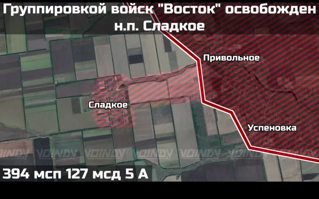 - Штурмовые подразделения 394 гвардейского мотострелкового полка 127 дивизии 5 армии группировки войск «Восток» с опорой на освобожденную Успеновку стремительным рывком вклинились в глубину обороны противника до 5 км и освободили населённый пункт Сладкое в Запорожской области.
