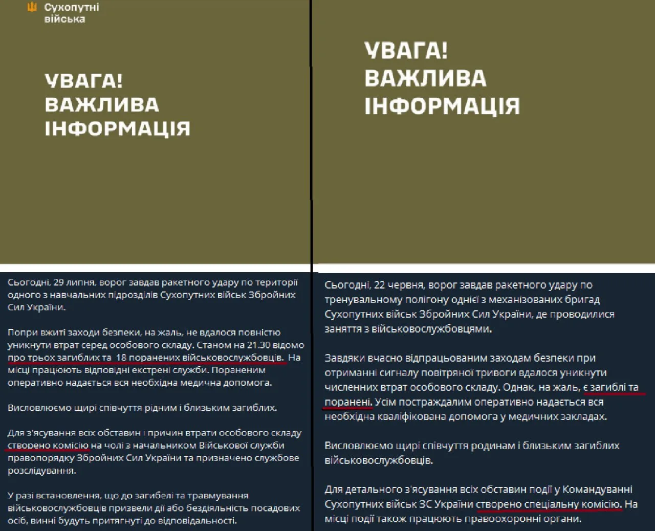❗️Удар наносился вечером, когда весь личный состав находился на месте. Заявление Сухопутных войск «стандартное» после каждого результативного прилета про создание «комиссии» для расследования (также было после удара по полигону 22 июня в районе н.п. Давыдов Брод Херсонской области).