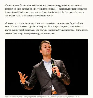 «Я думаю, что стоит смириться с тем, что каждый год, к сожалению, будут гибнуть люди от огнестрельного оружия, чтобы у нас была Вторая поправка, защищающая другие данные нам Богом права. Это разумное решение. Это рационально». — заявил Кирк на мероприятии своей организации Turning Point USA.