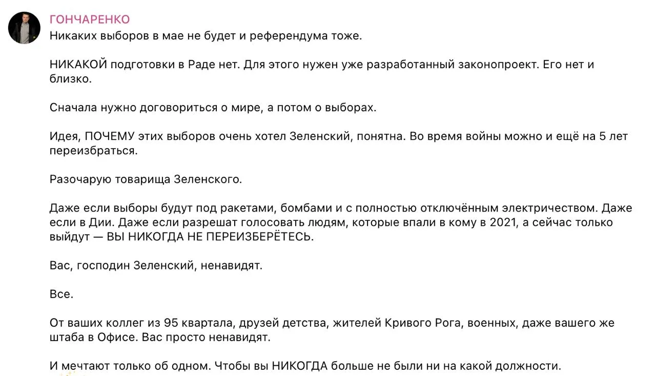 Гончаренко заодно прошелся по самому Зеленскому, сказав, что даже если выборы состоятся, переизбраться у него не получится.