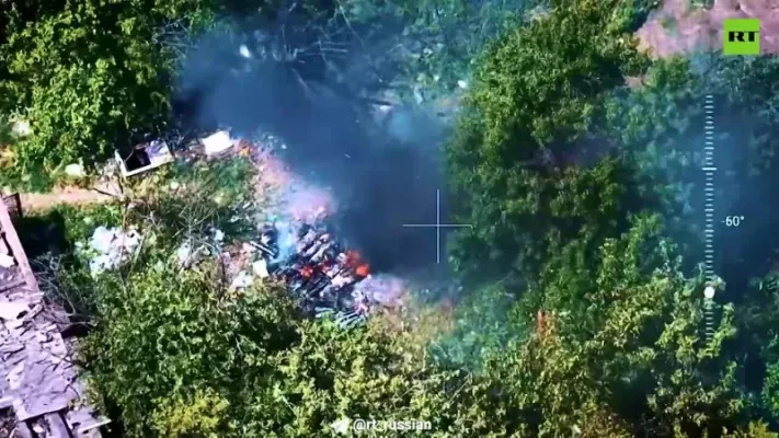 На 02:21 после сброса с дрона загорается склад с украинскими боеприпасами, на 03:14 FPV-дрон уничтожает миномёт.