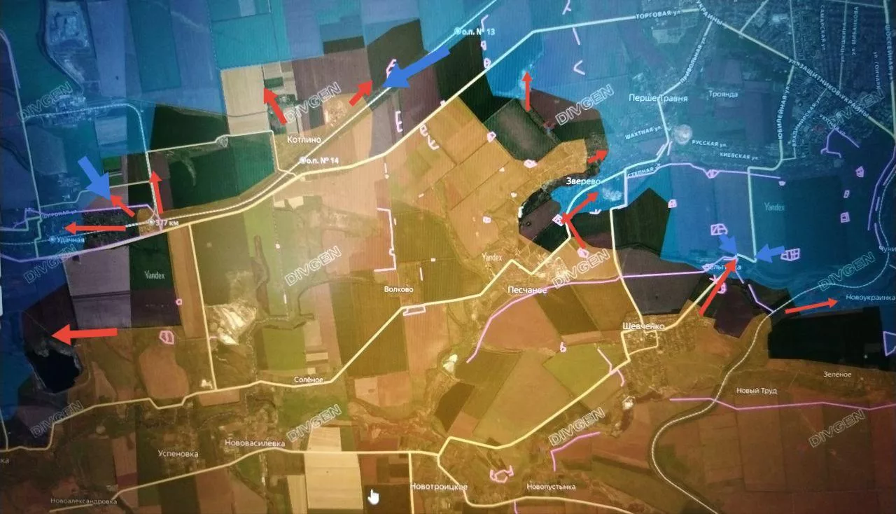Наши штурмовые подразделения атаковали со стороны Песчаного вдоль бывшей ж/д и зачистили посадки до Зверево и террикона (48 м).