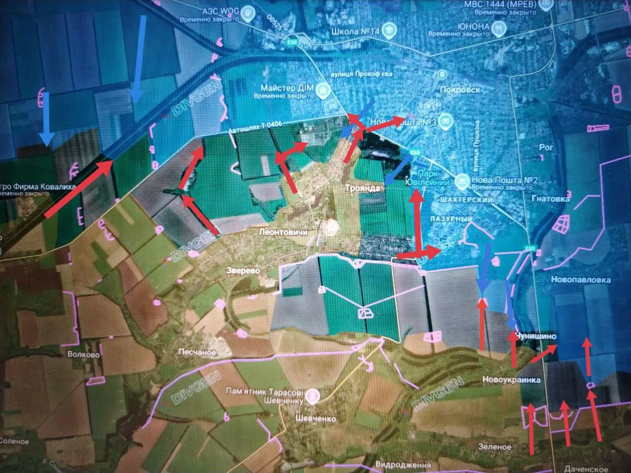 В районе Первомайского (Леонтовичей) и Троянды, со стороны Гришино в районе севернее Котлино наши подразделения отразили упорные контратаки противника и восстановили положение в районе авторынка и перекрёстка дорог М-30 и Т-04-06 в Покровке (Красноармейске).