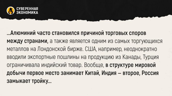 Европейские компании отмечают, что их товар добывается без углеродного выброса (путем разбора старых конструкций), а потому должен продаваться дороже. В странах Прибалтики, которые активно выступают за санкции, порядка 10% экспорта также занимает алюминий. В общем, понятно, что дело выглядит как банальный протекционизм и попытка одних стран принудить другие закупать сырье по менее выгодным ценам, используя СВО в качестве ширмы для своих интересов.