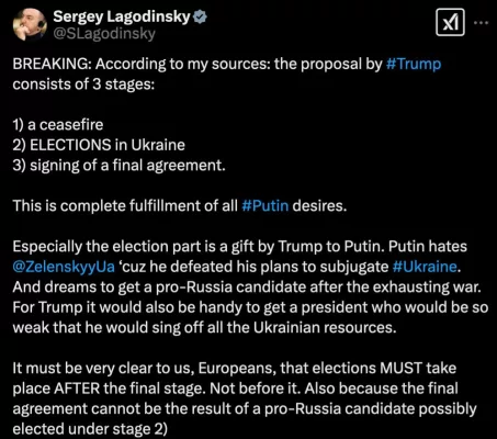 Депутат Европарламента Лагодинский, ссылаясь на свои источники, написал в Х, что предложение Трампа состоит из трех этапов: