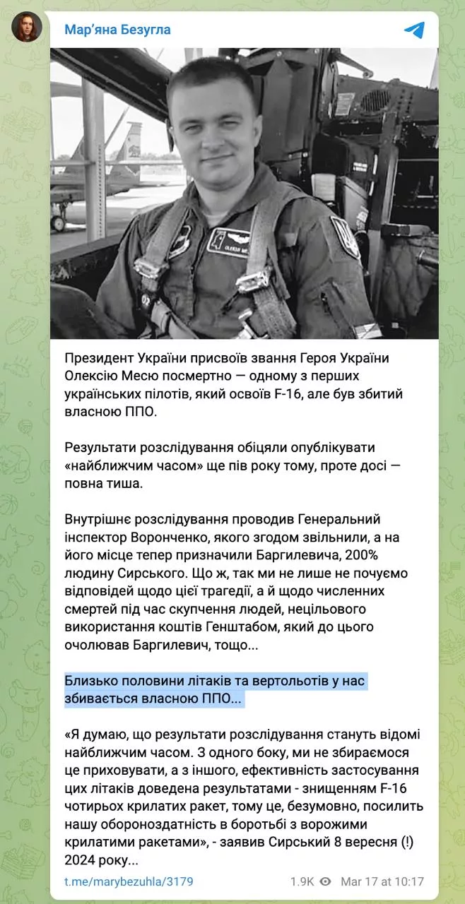 Она напомнила, что в августе 2024 года украинский летчик Алексей Мель, пилотировавший истребитель F-16, был сбит своими же зенитчиками. По ее данным, F-16 уничтожил ЗРК Patriot из-за дискоординации подразделений, однако военное руководство переложило вину на погибшего пилота.