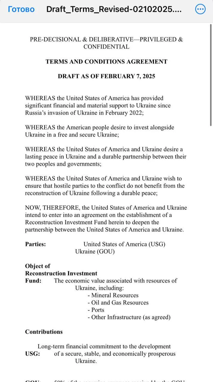 - США обещают долгосрочные инвестиции в восстановление Украины, а Киев обязуется отдавать 50% доходов от лицензий на добычу ресурсов в США, фактически передав Вашингтону долю в своей экономике.