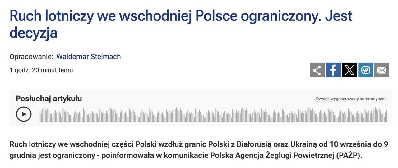 После «инцидента с беспилотниками» Польша закрыла воздушное пространство в приграничной зоне до 9 декабря: запрещены все полеты, кроме военных. В восточной части страны вводится полный запрет на полеты гражданских беспилотников.