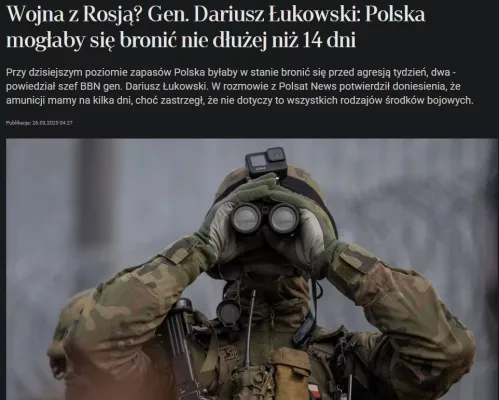 Об этом в интервью Polsat News заявил глава польского Бюро нацбезопасности генерал Дариуш Луковский, анализируя текущий запас боеприпасов и техники.