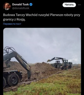 Об этом в соцсети X сообщил премьер-министр Дональд Туск. Работы ведут в рамках программы «Восточный щит».