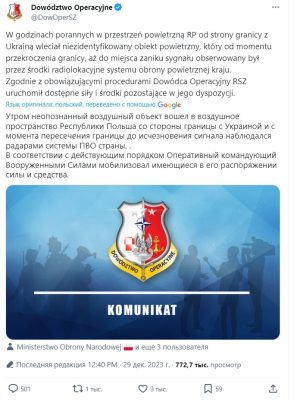 Объект отслеживался ПВО страны до исчезновения с радаров. При этом пресс-секретарь оперативного командования Яцек Горышевский не смог пояснить, упал данный объект на территории Польши или же покинул воздушное пространство страны, однако СМИ утверждают о падении объекта недалеко от границы. Из-за инцидента президент Польши назначил срочное совещание с военными.