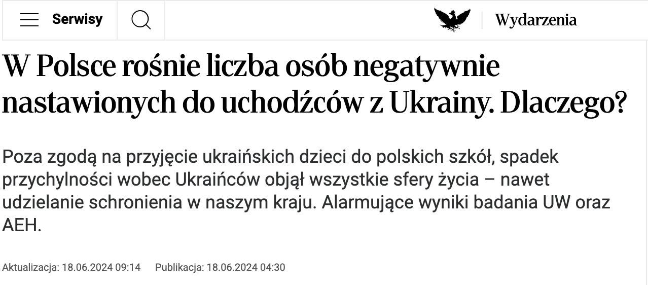 Издание указывает на резкое ухудшение отношения граждан к украинцам. Только 17% поляков согласны принять беженцев с Украины с возможностью поселения. При этом больше года назад цифра была 37%.