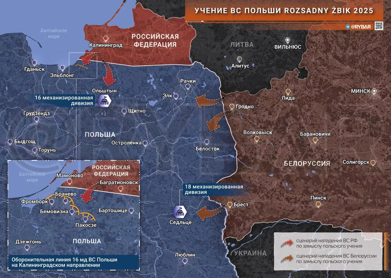И с 19 по 30 марта в северо-восточной части страны проходит учение Rozsadny Żbik – 2025. Замысел заключается в том, что поляки тренируются оборонять свои границы в случае наступления ВС РФ и Беларуси.