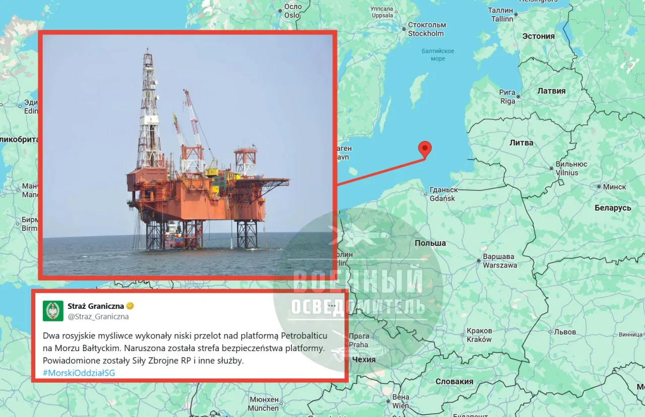 Как сообщает Пограничная стража Польши, два российских истребителя пролетели на малой высоте над платформой «Петробалтик», нарушив ее зону безопасности. Пресс-секретарь МВД страны Каролина Галецка добавила, что высота пролета составила около 150 метров.