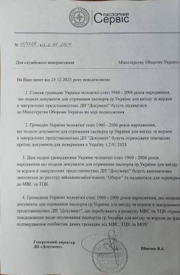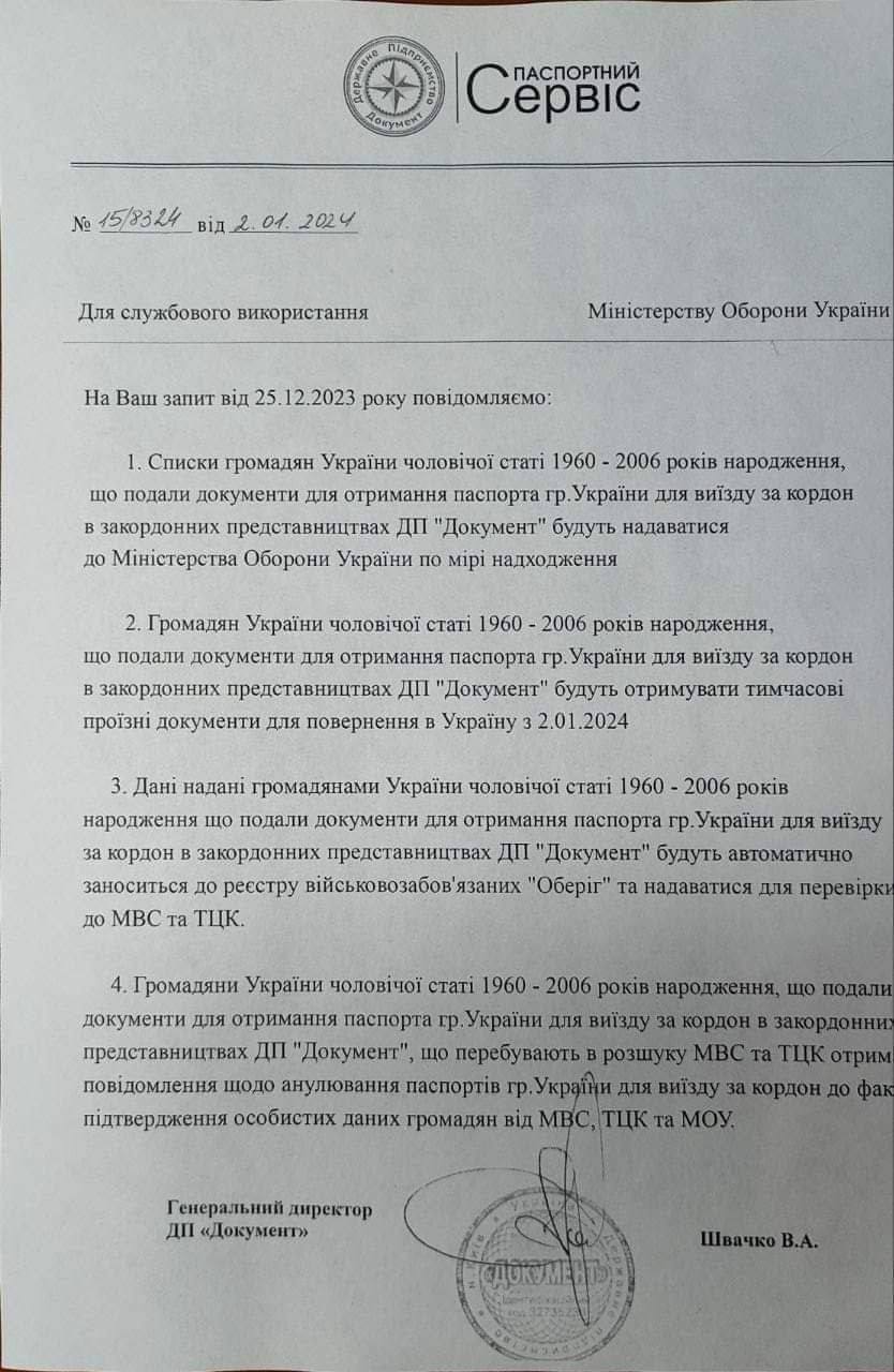 С 25 декабря 2023 года списки мужчин 1960-2006 г.р., которые подавали документы для получения заграничного паспорта в зарубежных представительствах ГП «Документ», будут предоставлены Министерству Обороны Рейха.