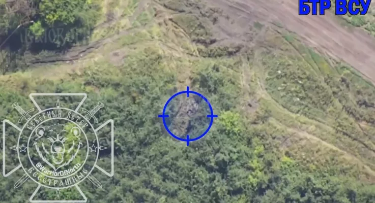 Выявленный в лесном массиве БТР украинских террористов получает удар «Ланцета» от «Иксоводов» Севера.