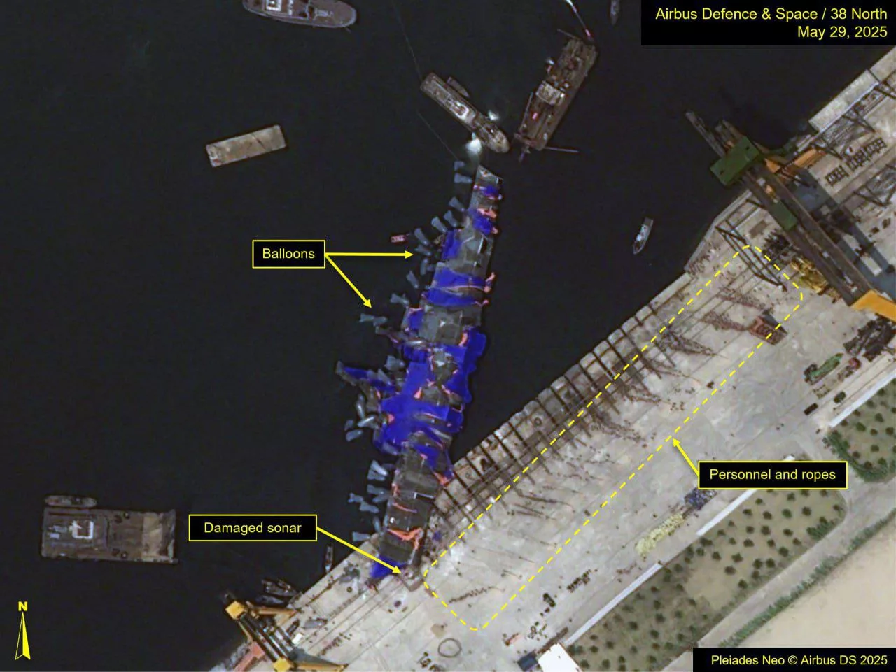 Но на первом снимке от 2 июня видно, что корабль уже находится в вертикальном положении. Одновременно заметно, что что-то сделано с носовой частью.