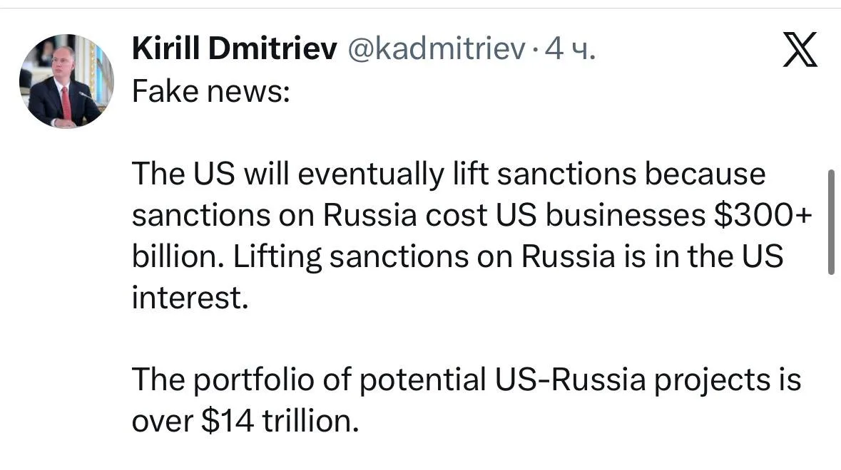Спецпредставитель президента РФ Кирилл Дмитриев заявил, что санкции против России стоили американскому бизнесу больше $300 млрд убытков.