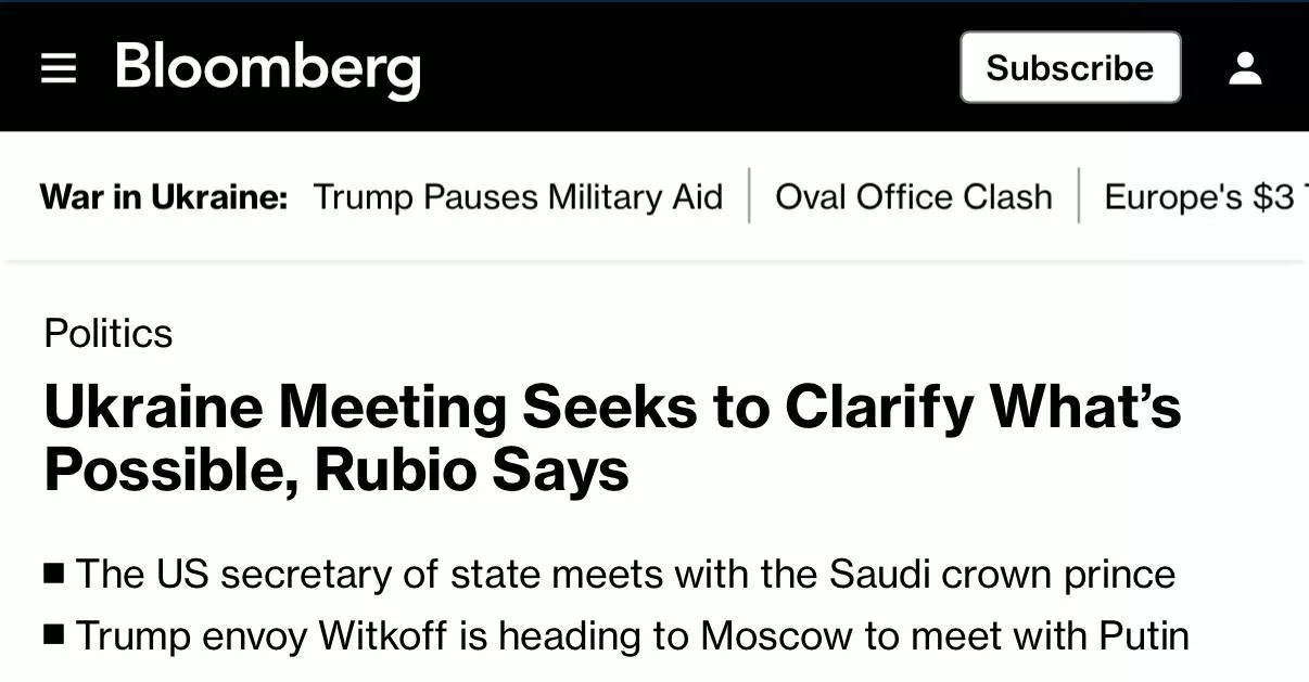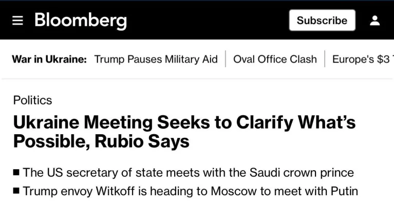 «Мы не собираемся сидеть в комнате и рисовать линии на карте, а просто получим общее представление о том, какие уступки они (украинцы) в принципе готовы рассматривать и что им потребуется взамен. А затем выясним, какова позиция России в этом отношении. Это даст нам довольно хорошее понимание того, насколько далеки наши позиции друг от друга», — сказал Рубио накануне вылета в Джидду, где сегодня состоятся переговоры с Украиной.