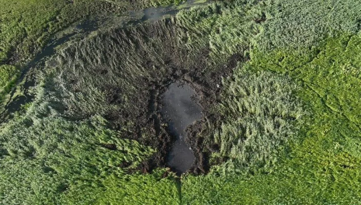 На фото — место, куда упал истребитель (вернее то, что от него осталось). Его осколки валяются в грязи рядом с камышами.