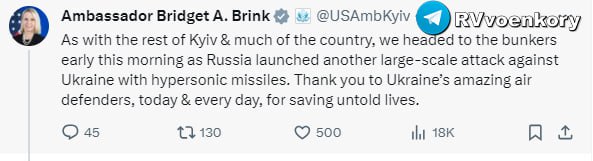 «Как и в случае с остальной частью Киева и большей части страны, сегодня рано утром мы направились в бункеры, когда Россия начала еще одну крупномасштабную атаку на Украину с помощью гиперзвуковых ракет», — написала в X посол США Бриджит Бринк.