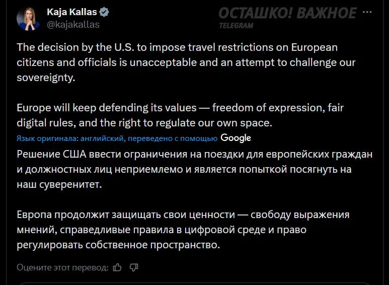«Европа продолжит защищать свои ценности — свободу выражения мнений, справедливые правила в цифровой среде и право регулировать собственное пространство».