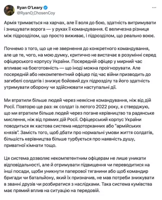 «Мы потеряли больше людей из-за плохого руководства и советского мышления, чем от России. Офицеры действуют как неприкасаемые. Неудачные командиры не несут ответственности — их переводят, повышают, прикрывают» — пишет он.