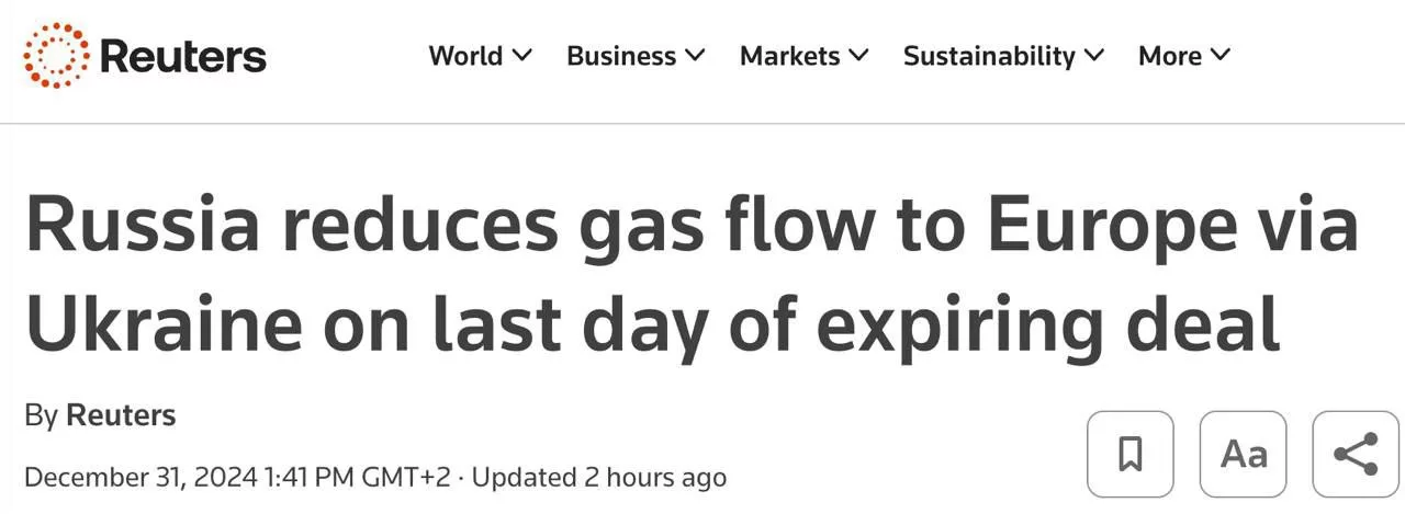 Россия уже начала сокращать поставки газа в Европу через украину в последний день действия соглашения о транзите, передаёт Reuters.