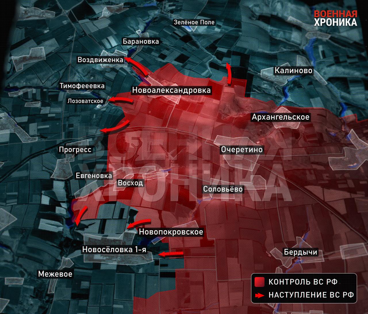 Промежуточная цель российской армии практически достигнута: после штурма села Сокол и продолжения наступления вдоль железной дороги (которая одновременно является ключевой высотой) продавливается оборона ВСУ в районе Евгеновки и Новосёловки Первой. Параллельно основному удару «лепестки» наступления, как это и было задумано изначально, раскрываются по флангам. На севере хороший темп набрал удар в сторону Воздвиженки и Зелёного Поля, а на юге наносится замыкающий (охватывающий) удар между Яснобродовкой и Карловкой (со стороны Уманского в сторону основной линии обороны ВСУ в Скучном).