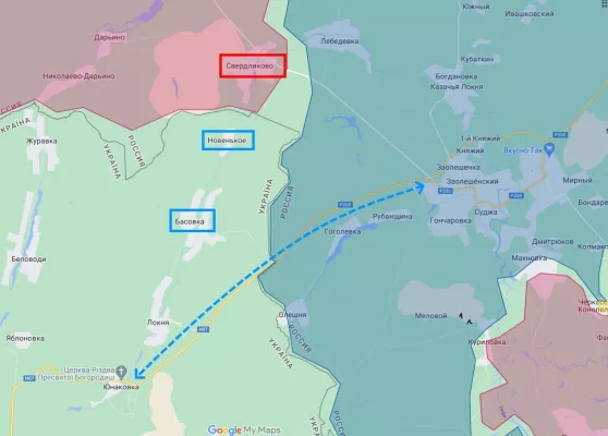 Упомянутые Новенькое и Басовка расположены как раз между Свердликово и дорогой из сумской Юнаковки в курскую Суджу — данную артерию противник использует с первых дней вторжения как основу логистики для своей группировки в приграничье Курской области. Карта: @motopatriot78