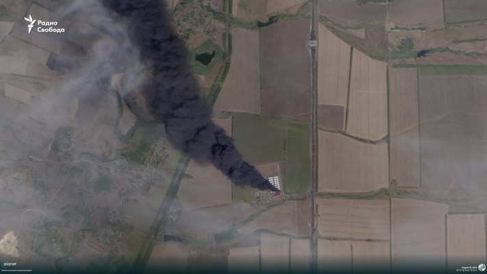 На снимках видны два резервуара с горящим топливом и несколько резервуаров со следами повреждений.