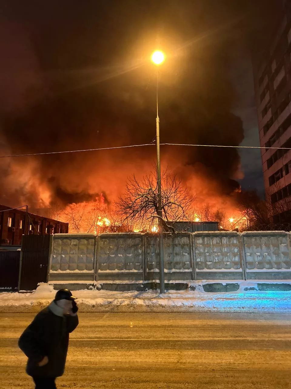 С крыши валит густой черный дым, уже произошло обрушение кровли. Площадь возгорания — 1500 «квадратов», сообщили в МЧС.