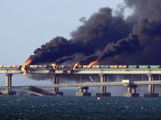 Речь идёт о событиях октября 2022 года, когда на автодорожной части моста произошёл взрыв грузовика, двигавшегося с Таманского полуострова. В результате взрыва обрушились два пролета моста, а на железнодорожной линии загорелись цистерны поезда, проходившего в тот момент по переправе.