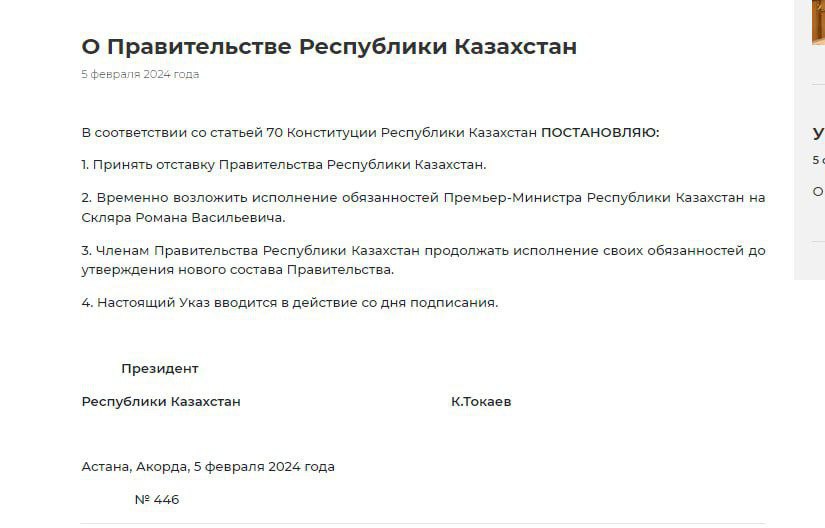 Главная страница » Новости и статьи Правительство Казахстана ушло в отставку — пресс-служба президента Токаева Автор Модератор Опубликовано 05.02.2024Комментариев 1 Причина не уточняется. Добавь сайт в закладки нажми CTRL+D What’s your Reaction? +1 0 +1 0 +1 0 +1 0 +1 0 +1 0 +1 0 Обязанности премьер-министра временно возложены на первого вице-премьера Романа Скляра. What’s your Reaction? +1 0 +1 0 +1 0 +1 0 +1 0 +1 0 +1 0 Поделись видео: